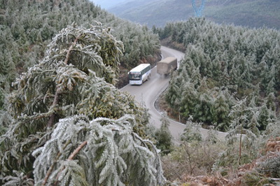 連日來,貴州海拔最高公路——102省道六盤水境內的梅花山路段出現道路結冰狀況,結冰厚度超過一公分,交警部門開始對該路段撒鹽除冰,并實施交通管制。