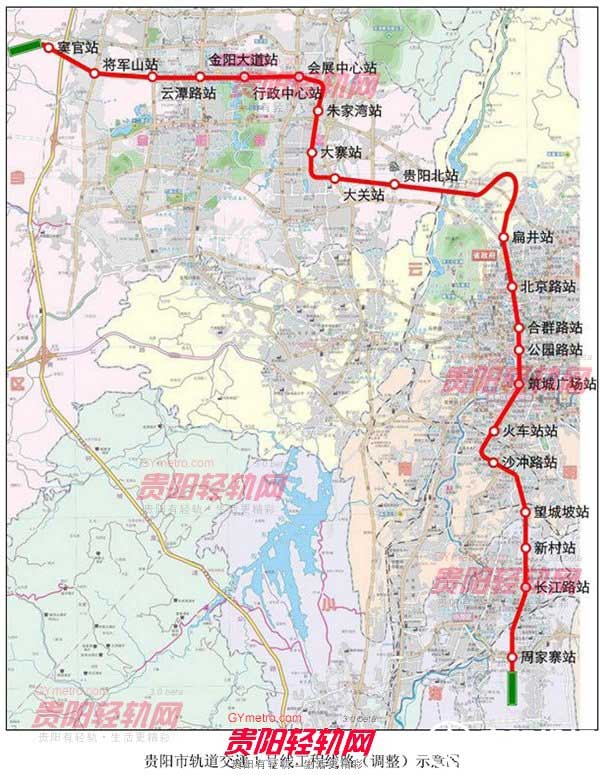 貴陽輕軌1號線全長34.3公里,共設24座車站、23個區(qū)間、一個車輛段、一個停車場、一個運營控制中心、兩個變電所。老城區(qū)剩余21.9公里土建全面進場工程,共涉及14站14區(qū)間及竇官車輛段、小河停車場,分11個工作段組織實施,沿線設置8個斜(豎)井。 軌道交通1號線經過的路線,涉及觀山湖、云巖、南明、經開四個城區(qū),共有23個站點,兩城區(qū)站點有,安云路站、北京路站、延安路站、中山路站、人民廣場站、火車站站,沙沖路站,為地下站點,也就是說在老城區(qū),軌道交通1號線全走地下。至于票價,預計2元起價,1號線全程路費不超過8元。 貴陽地鐵1號線路線圖: 【相關附件】: ![]() |