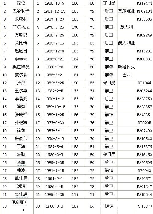 守門員 沈俊:身披1號(hào)球衣 出生日期:1986年10月5日 身高:186cm 體重:88kg 籍貫:上海 張烈:身披12號(hào)球衣 出生日期:1982年2月25日 身高:190cm 體重:85kg 籍貫:沈陽 沈鵬:身披22號(hào)球衣 出生日期:1989年2月19日 身高:188cm 體重:80kg 籍貫:徐州 孫繼海:身披17號(hào)球衣 場(chǎng)上位置:后衛(wèi) 1977年9月30日出生于遼寧省大連市 身高:183cm 體重:75kg 納諾(Nano):身披7號(hào)球衣 出生日期:1980年7月7日 身高:1米86 體重:79kg 久比奇: 身披6號(hào)球衣 出生日期:1983年2月16日 身高193 體重:85kg 國籍:澳大利亞 吳偉:身披2號(hào)球衣 出生日期:1983年3月10日 身高:191cm 體重:80kg 籍貫:天津 張成林:身披3號(hào)球衣 出生日期:1987年1月20日 身高:183cm 體重:76kg 籍貫:安徽 萬厚良:身披5號(hào)球衣 出生日期:1986年2月25日 身高:186cm 體重:79kg 籍貫:北京 蘆強(qiáng):身披5號(hào)球衣 出生日期:1989年1月8日 身高:186cm 體重:87kg 籍貫:大連 劉天祺:身披19號(hào)球衣 出生日期:1989年1月17日 身高:182cm 體重:80kg 籍貫:黑龍江 董陽:身披28號(hào)球衣 出生日期:1983年1月14日 身高:187cm 體重:80kg 籍貫:北京 中場(chǎng) 李春郁:身披9號(hào)球衣 出生日期:1986年10月9日 身高:184cm 體重:78kg 籍貫:沈陽 前衛(wèi) 于海:身披21號(hào)球衣 出生日期:1987年6月4日 身高:183cm 體重:70kg 籍貫:河南 楊一虎:隊(duì)內(nèi)最具潛力的小將 90后 攻破皇馬大門 身披14號(hào)球衣 場(chǎng)上位置:前衛(wèi) 出生日期:1991年9月16日 身高:175cm 體重:65kg 籍貫:廣東深圳 羅達(dá)斯:身披20號(hào)球衣 出生日期:1984年1月1日 身高172cm 體重75kg 國籍:阿根廷 楊昊: 身披29號(hào)球衣 出生日期:1983年8月19日 身高:176cm 體重:66kg 籍貫:北京 王爾卓:身披13號(hào)球衣 出生日期:1987年2月5日 身高:175cm 體重:71kg 籍貫:西安 陳杰:身披15號(hào)球衣 出生日期:1989年10月1日 身高:175cm 體重:70kg 籍貫:深圳 楊磊:身披24號(hào)球衣 出生日期:1993年1月9日 身高:180cm 體重:71kg 籍貫:云南麗江 廖林琨:身披26號(hào)球衣 出生日期:1993年1月1日 身高:186cm 體重:81kg 籍貫:武漢 郭勝: 身披33號(hào)球衣 出生日期:1993年1月7日 身高:180cm 體重:75kg 籍貫:上海 前鋒 曲波:“追風(fēng)少年” 身披27號(hào)球衣 出生日期:1981年7月15日 身高:182厘米 體重:72kg 籍貫:天津 穆斯利莫維奇(Zlatan Muslimovic) 身披9號(hào)球衣 出生日期:1981年3月6日 身高:189cm 國籍:波黑 拉法·約爾達(dá):陽光男孩 身披11號(hào)球衣 出生日期:1984年1月11日 身高:192 體重:85kg 國籍:西班牙 李凱:身披25號(hào)球衣 出生日期:1989年7月25日 身高:188cm 體重:80kg 籍貫:青島