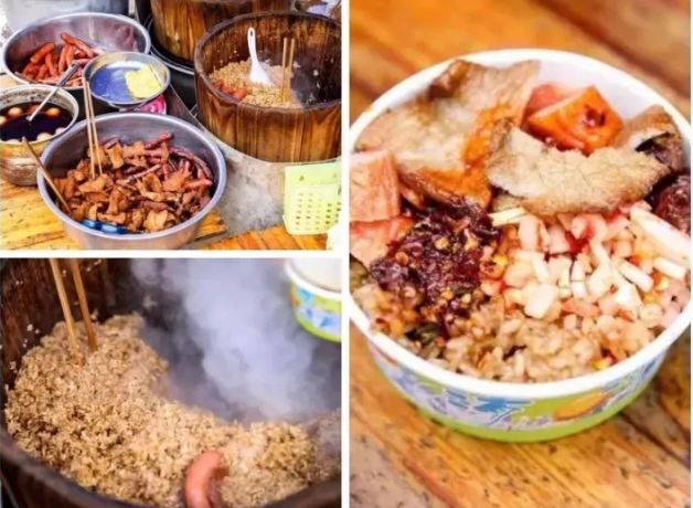 熱氣騰騰的糯米飯,加上香腸、肉片、火腿等配上些辣椒,香氣撲鼻。